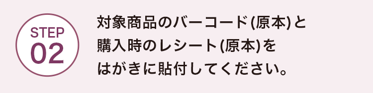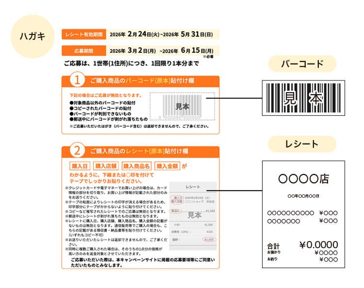 (2)専用応募ハガキをダウンロードし、応募条件を満たす購買証明(レシート・明細書・納品書・購入証明メール等)と購入製品パッケージのバーコードをご貼付の上、必要事項をご明記いただき、キャンペーン事務局宛にご郵送ください。