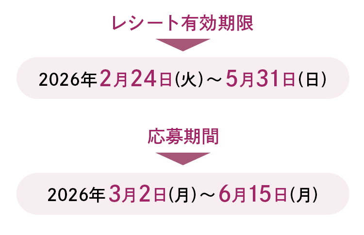 ※レシートに購入日、購入店舗、購入商品名、購入金額の記載がないものは無効となります。